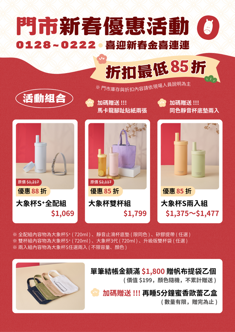 凡於大象杯官網或門市消費, 即可領取馬年開運紅包袋乙組! 已經送出破百組了 🔥 快把握限量機會 🤩