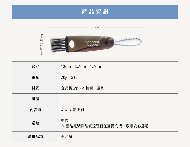 專為大象杯使用者設計的「大象杯 3-way 清潔刷」正式誕生!集 3 種功能於一身,我們獨家設計了刷頭的尺寸與細節,讓您可以完美的刷到大象杯的每一個縫隙。