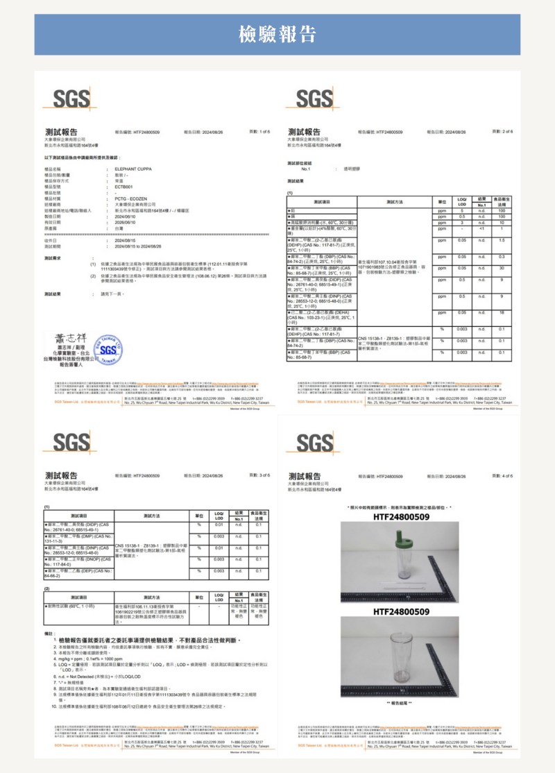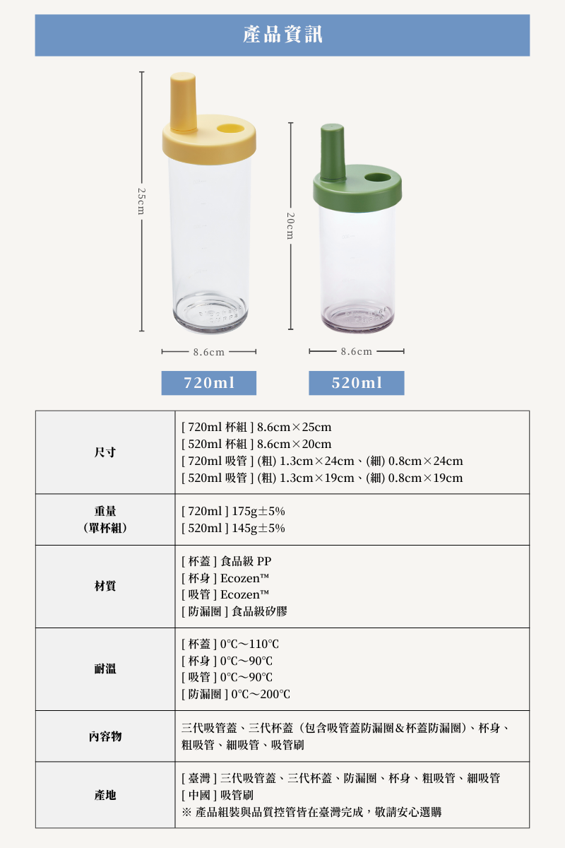﹒Ecozen™ 飲料杯身 ﹒食品級PP 飲料杯蓋&吸管蓋(含防漏圈) ﹒Ecozen™ 粗吸管 & 細吸管 ﹒吸管刷