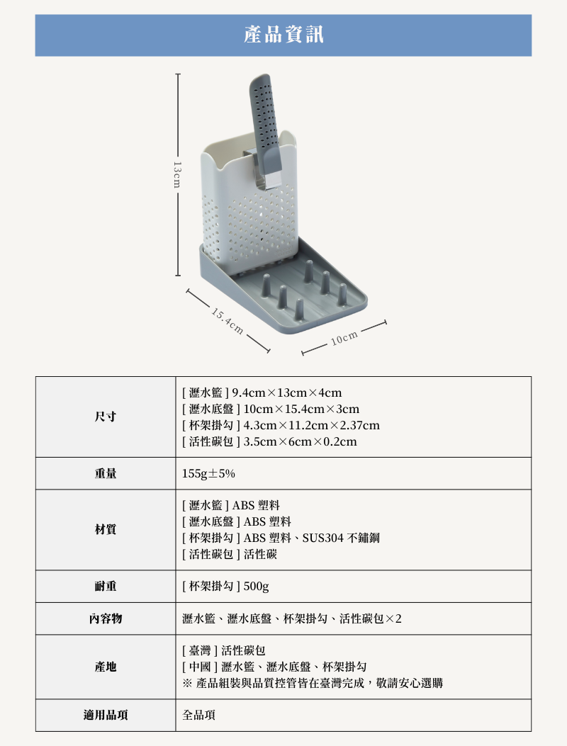 呼吸瀝水籃 x1 波浪集水底盤 x1 活性碳杯架掛勾(可拆卸) x1 活性碳包 x2