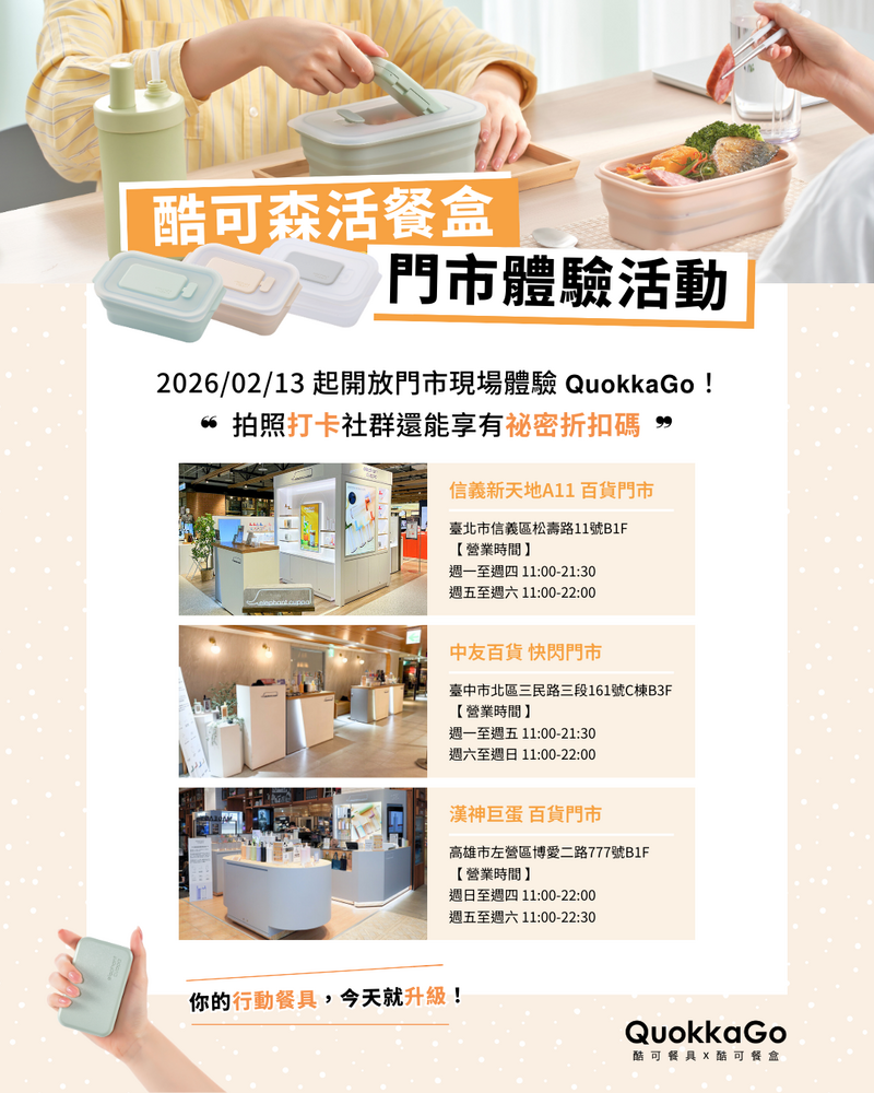 還在猶豫尺寸、顏色,或是想親自感受「摺疊餐盒 ✕ 掌心餐具」的便利性嗎? 我們幫大家爭取到了線下秘密福利 🤫