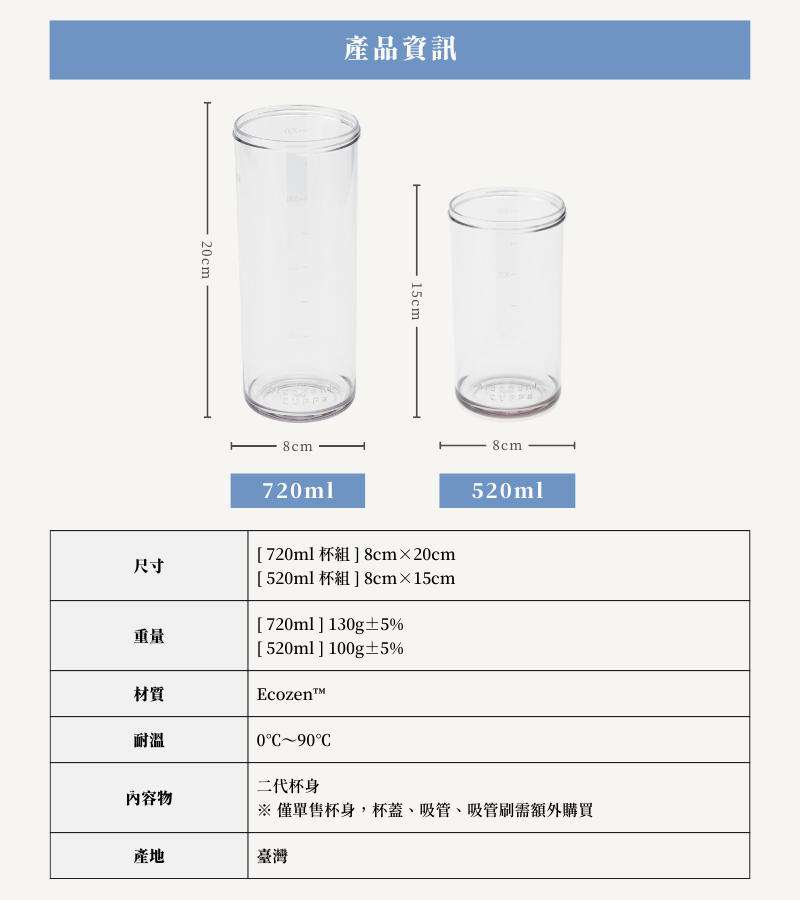 〔520ml〕直徑78mm x (H)145mm • 容量:720ml / 520ml • 材質:Ecozen™ • 耐溫:耐低溫0°C ~高溫90°C • 產地:台灣