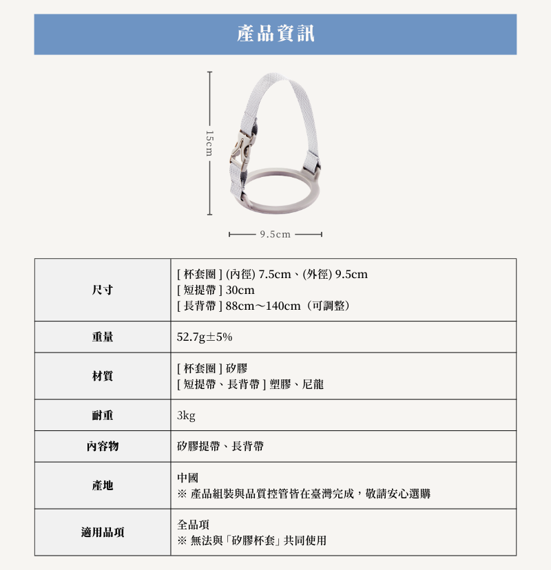 ﹒杯套材質:矽膠 ﹒背帶材質:尼龍 ﹒尺寸:內徑7.5cm/外徑9.5cm/短提帶30cm/長背帶88-140cm ※ 商品含一條可調整長度的長背帶 ※ 無法與矽膠杯套共同使用